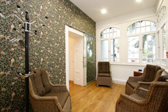 Die neurologische Praxis verfügt über eine Anmeldung, einen Warteraum im alten Wintergarten, einen Diagnostikraum und zwei Behandlungszimmer. Selbstverständlich ist auch unser WC barrierefrei. Direkt hinter dem Haus befinden sich die Parkplätze der Praxis. Von hier hat man auch Zugang zum Aufzug, der direkt in die Praxisräume führt. Der Haupteingang der Villa befindet sich an der der Strasse zugwandten Seite.